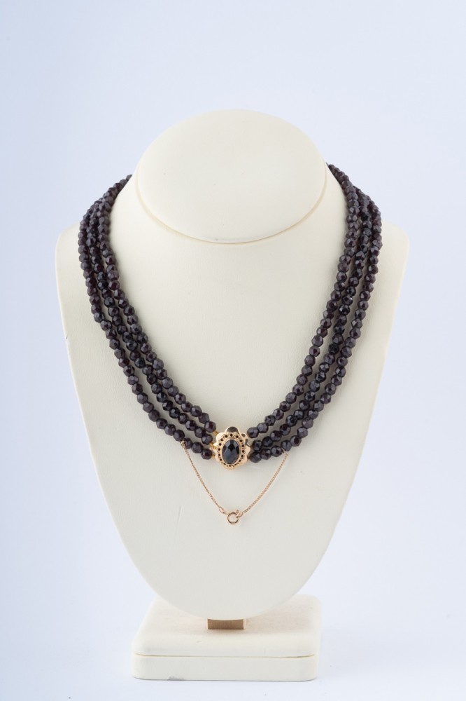 3-strengs granaten collier aan gouden sluiting met een granaat