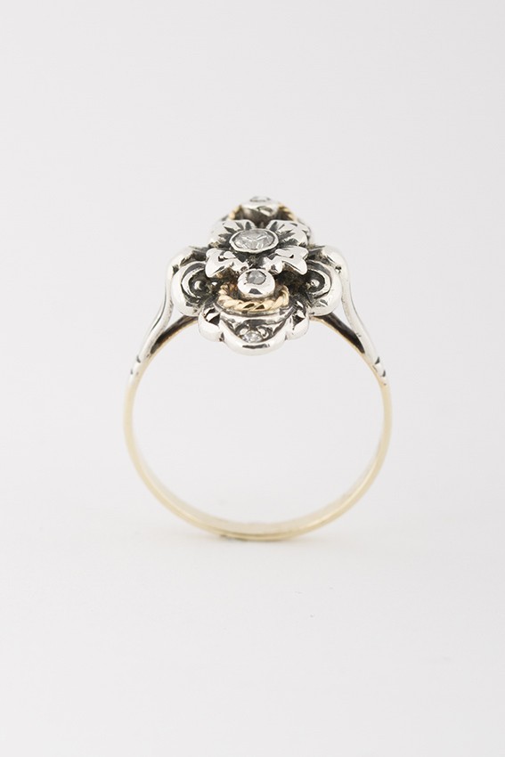 14 krt. antieke goud/zilveren ring met een briljant van ca. 0.07 ct. en roos geslepen diamanten.