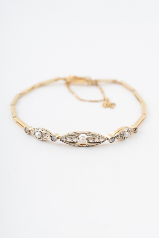 Antieke gouden schakel armband met roos geslepen diamanten en parels