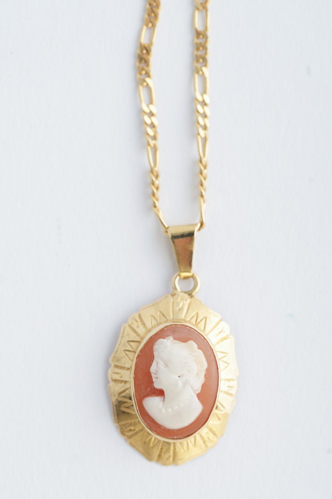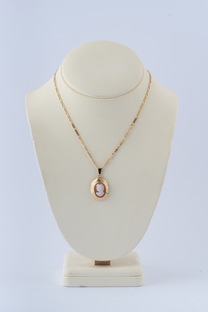 Camée in 14 krt. gouden rand hanger aan 14 krt. gouden figaro collier.
