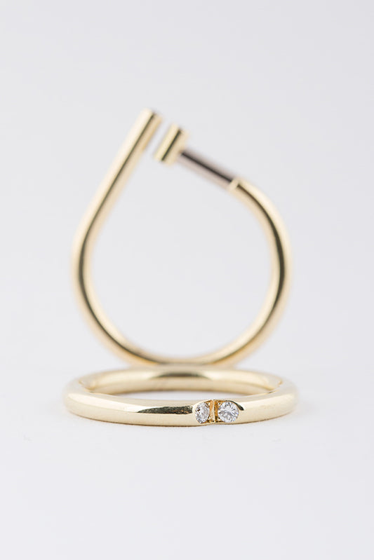 Two 14 carat gold rings, each with two brilliant-cut diamonds.