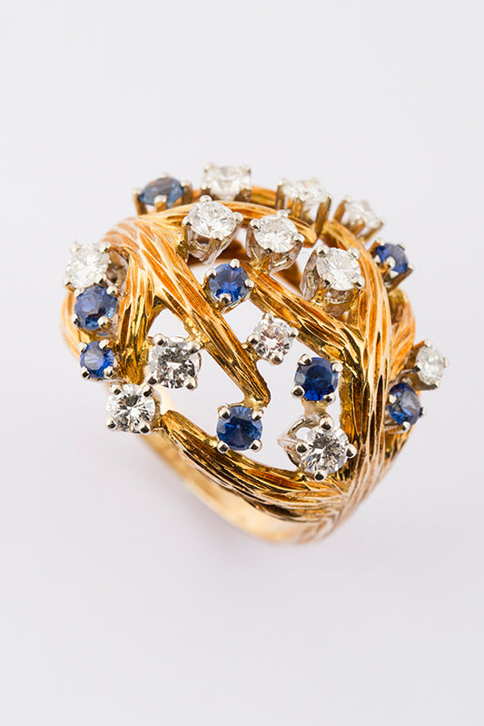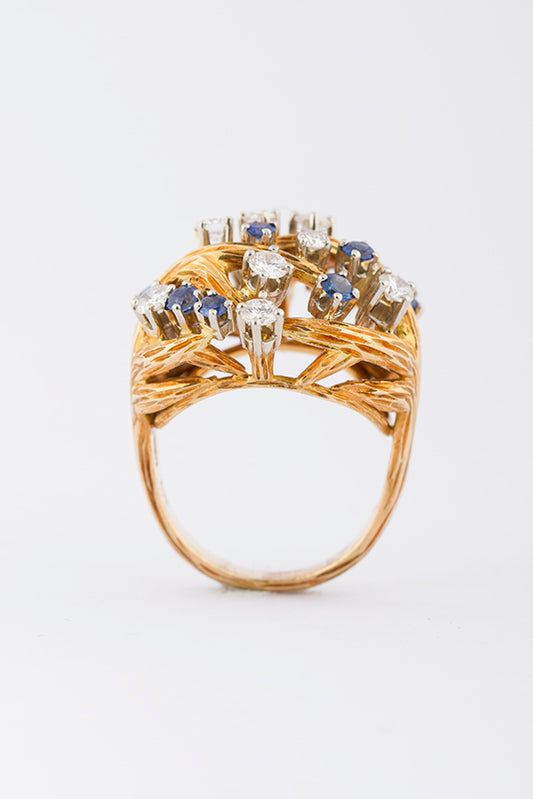 18 carat gold ring with 12 brilliant-cut diamonds and sapphires.