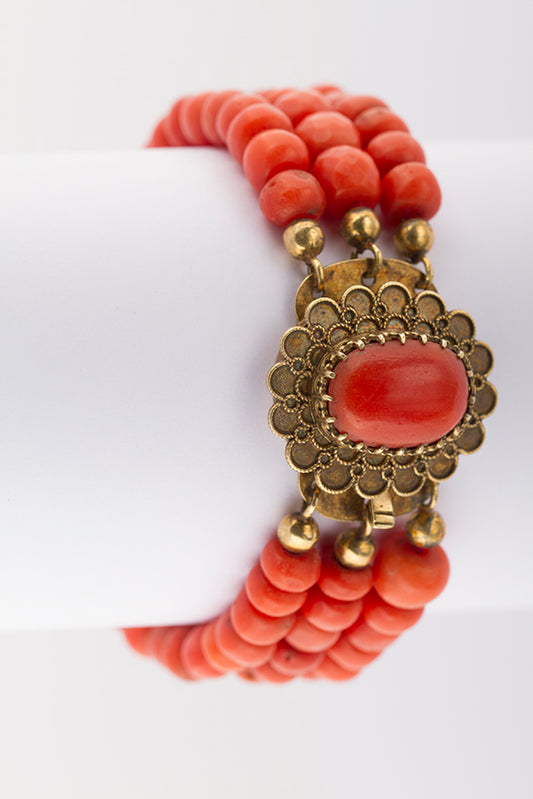 3-strand red coral bracelet in 14 kt. gold clasp with red coral.