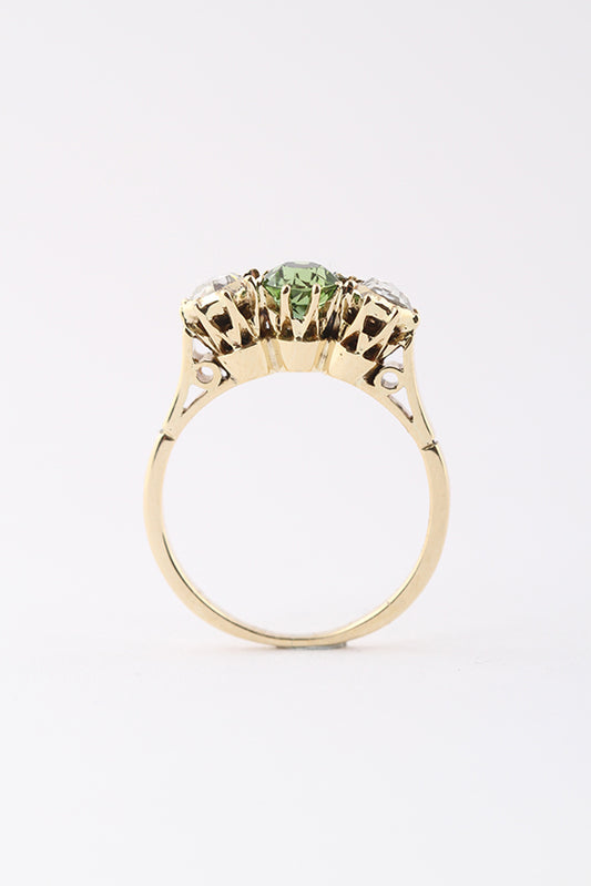 Antique 14-karat gold row ring with a peridot and two rose-cut diamonds set in silver.