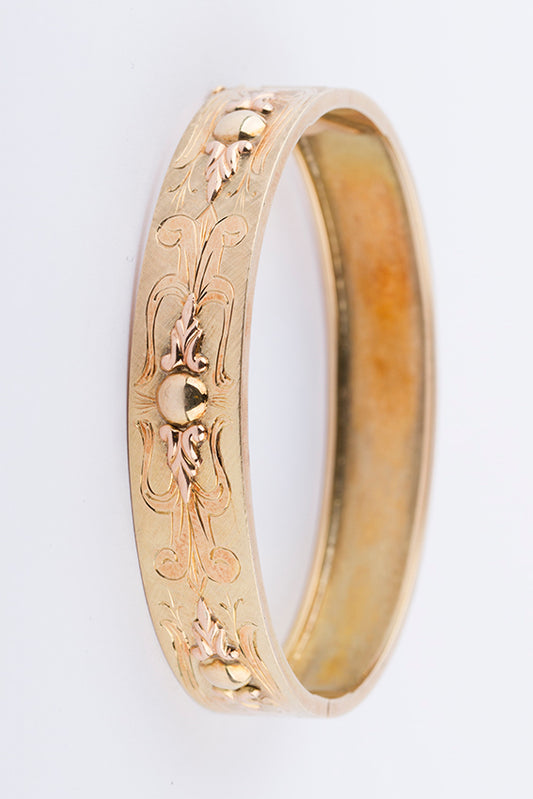 14 carat gold engraved bangle/bracelet with hinged closure.