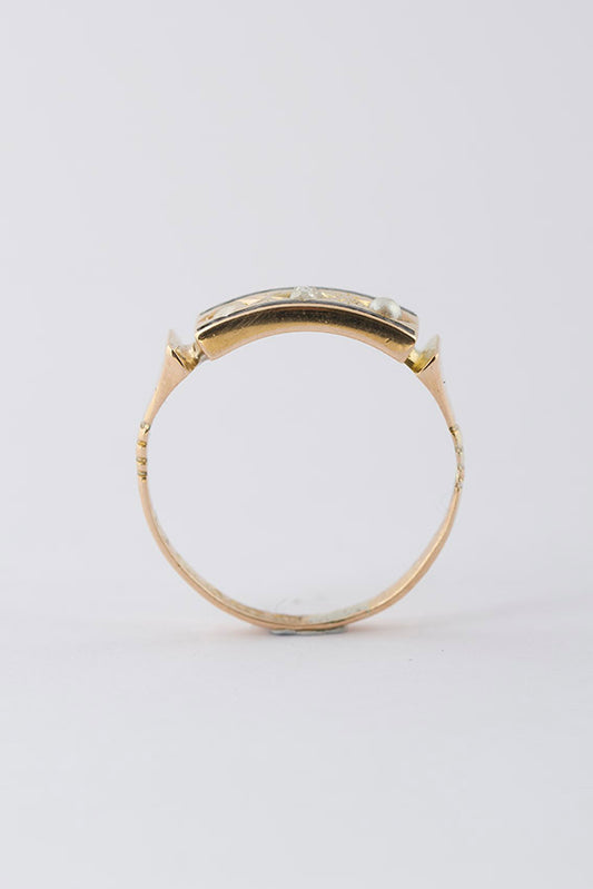 Antique gold English row ring with enamel, pearl and rose diamond.