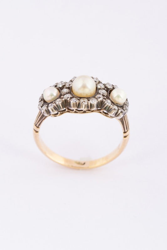 Antique gold entourage ring with cultured pearls and Bolshevik-cut diamonds
