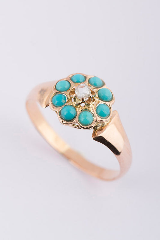 Antique 18-karat gold entourage ring with turquoise and rose-cut diamond.
