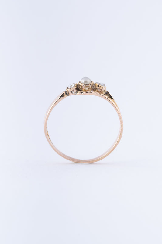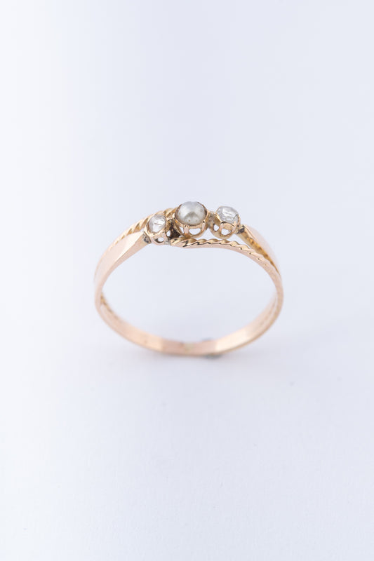 Antieke 14 krt. gouden ring met een parel en 2 roos geslepen diamanten.