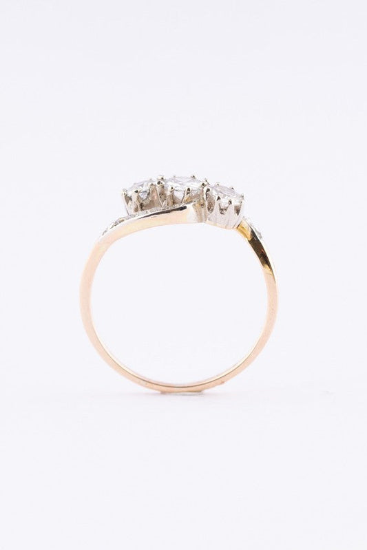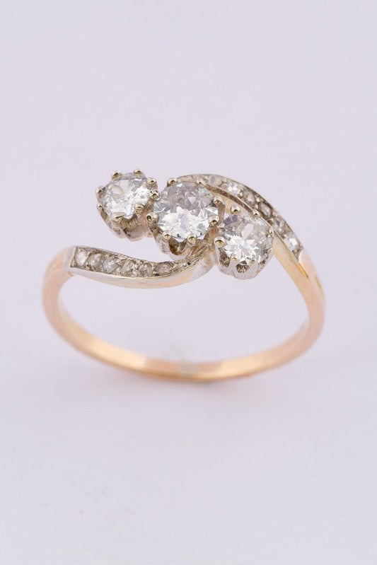 Antique 14-karat gold ring with three old-cut brilliant-cut diamonds, approximately 0.65 ct., and 12 rose-cut diamonds. Total approximately 0.70 ct.