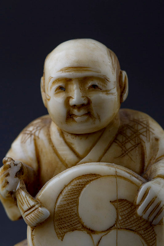 Antique ivory okimono, man with drum. Japan, 19th century. (Damaged).