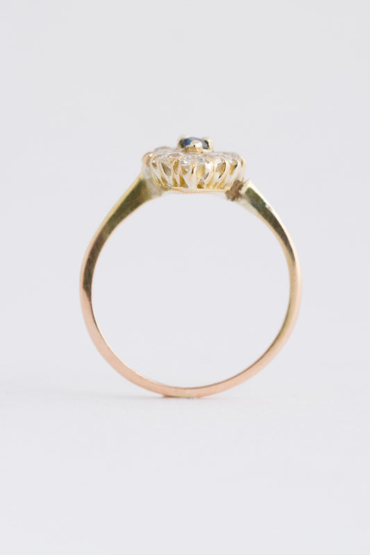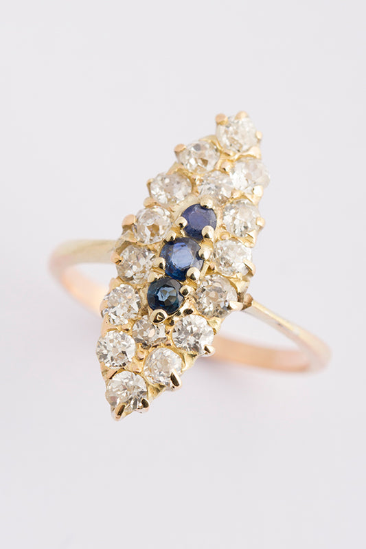 Antique gold marquise ring with 3 sapphires and 16 old-cut brilliants.