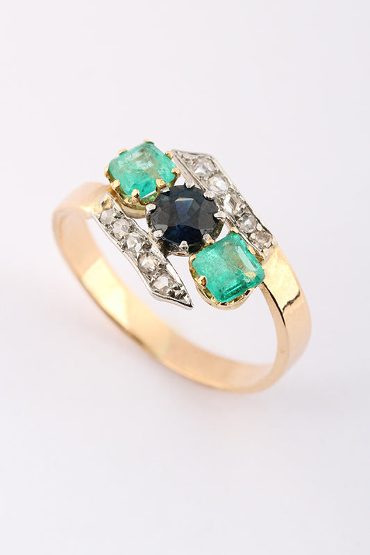 Antique 18-karat gold ring with sapphire, two emeralds, and ten rose-cut diamonds set in platinum.