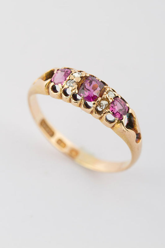 Antique gold Victorian row ring with tourmaline and 4 rose-cut diamonds.
