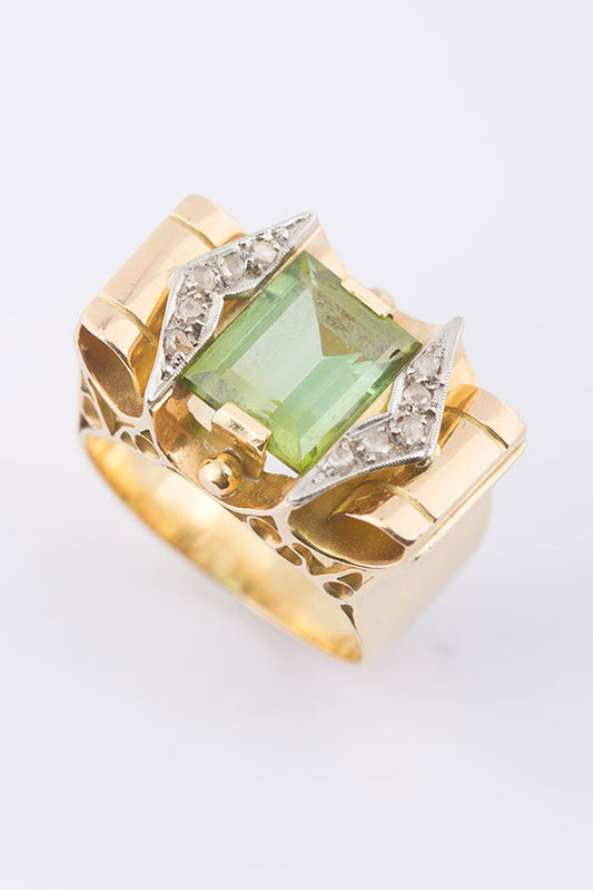 18-karat gold 1940s ring with peridot and rose diamonds. (Retro ring, France)