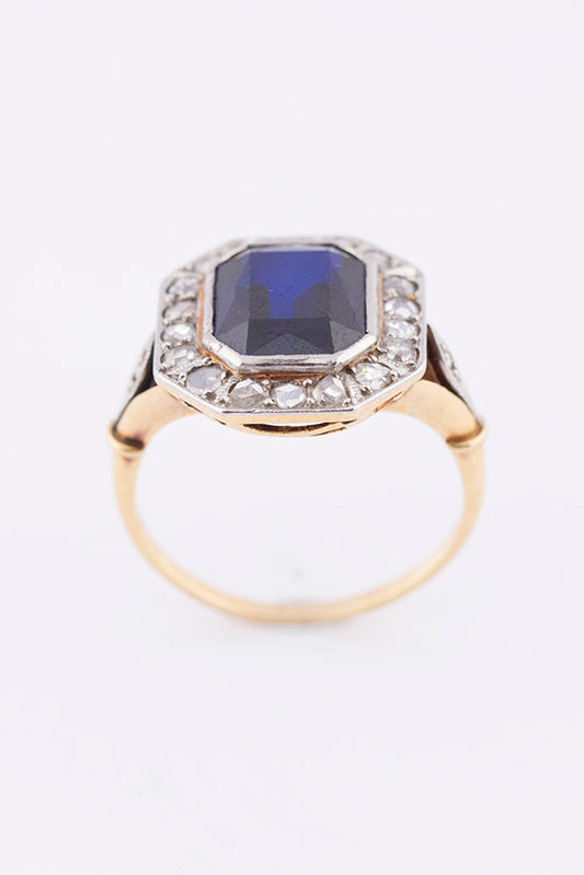 18 carat gold ring with sapphire and diamonds set in platinum.