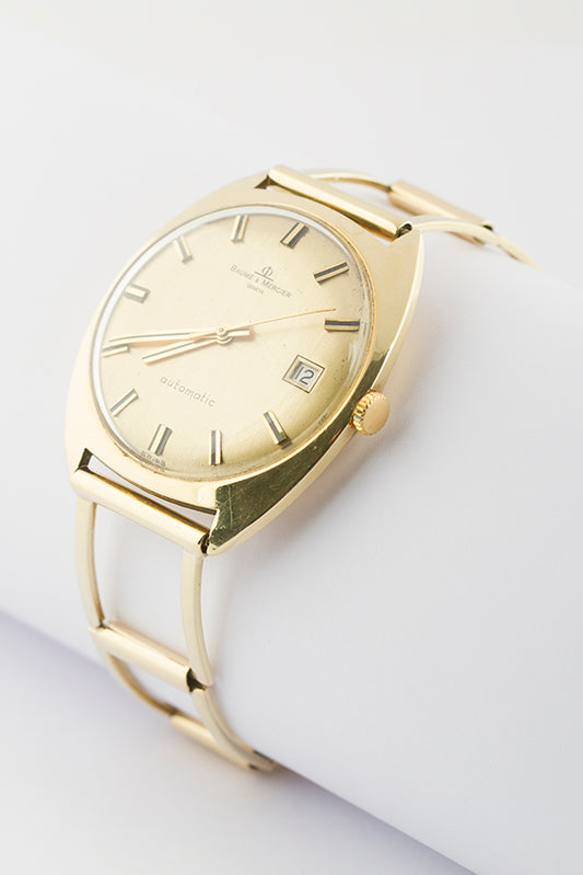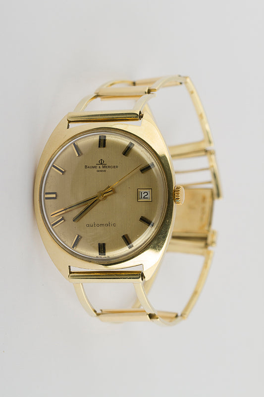 14 carat gold watch from the Baume & Mercier Automatic brand on a 14 carat gold tropical strap.
