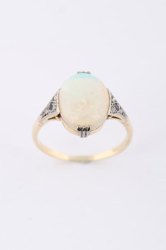 Old 14 carat gold ring with crystal opal, rose diamond, and sapphire.