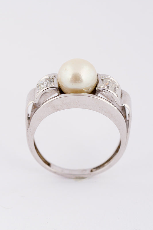 14-karat white gold Demodé ring with a cultured pearl and Bolshevik-cut diamonds. 1940s.