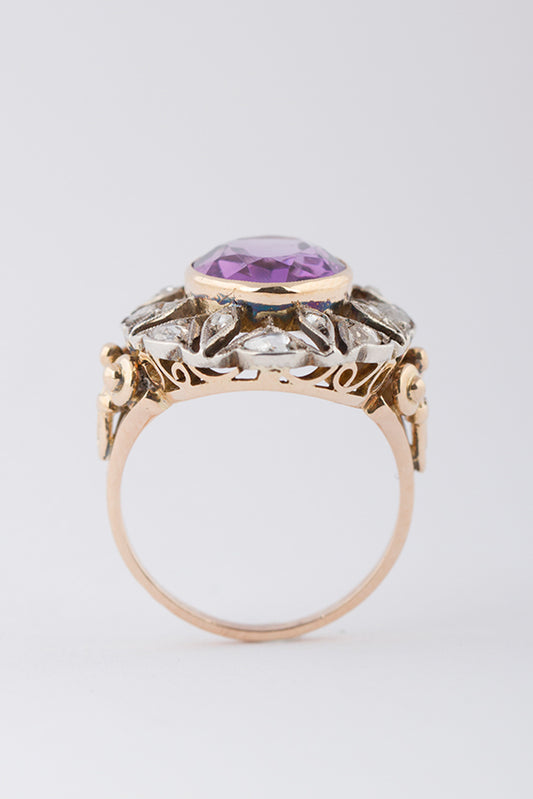 14-karat gold entourage ring with an amethyst and rose-cut diamonds. (Poland 1963-present).