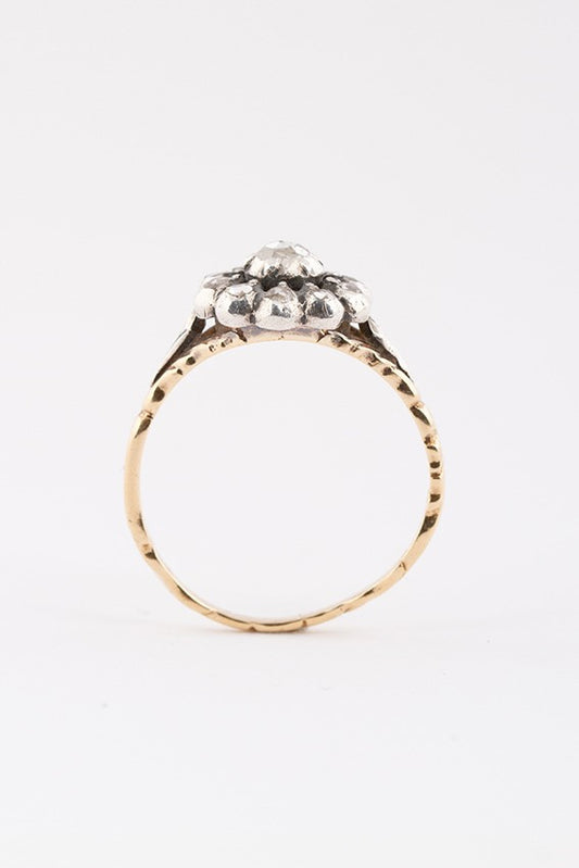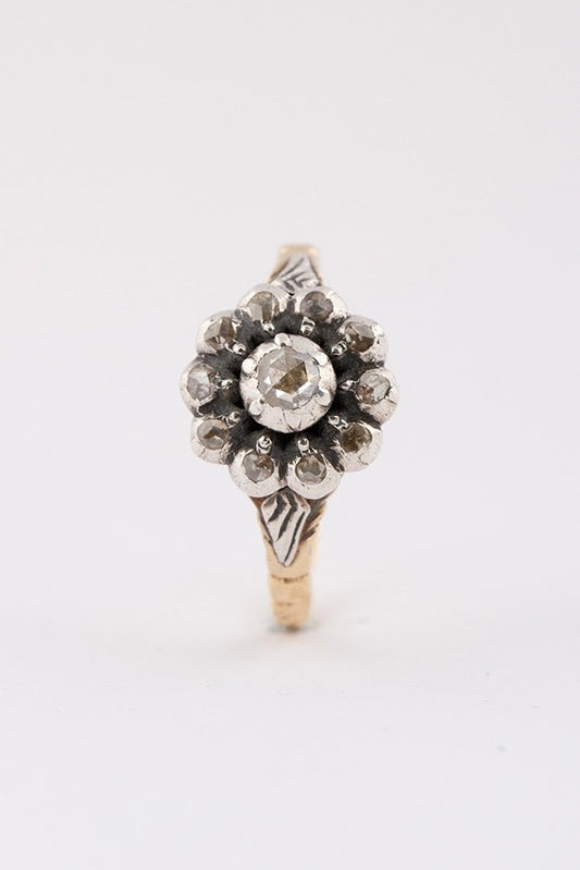 Old 14-carat gold entourage ring with rose-cut diamonds set in silver.
