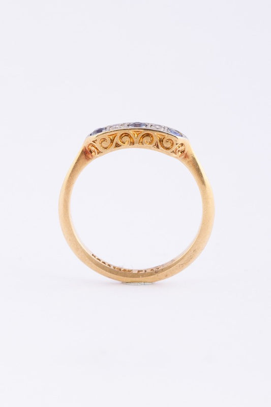 Gold row ring with 3 sapphires and 2 brilliants set in platinum