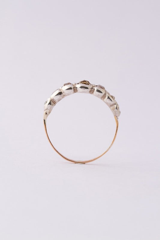 Antique 14-carat gold ring with seven rose-cut diamonds set in silver.