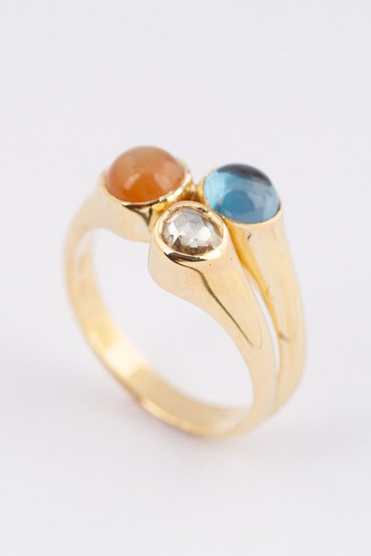 Gold ring with 3 gemstones including a rose-cut diamond, topaz and chalcedony