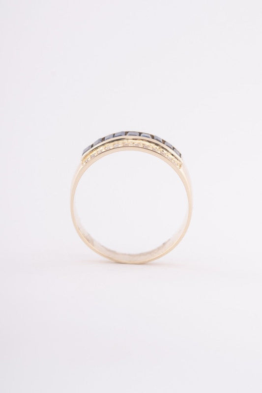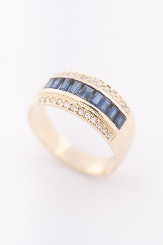 Gold ring with baguette-cut sapphires and 24 brilliant-cut diamonds