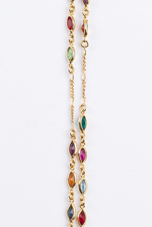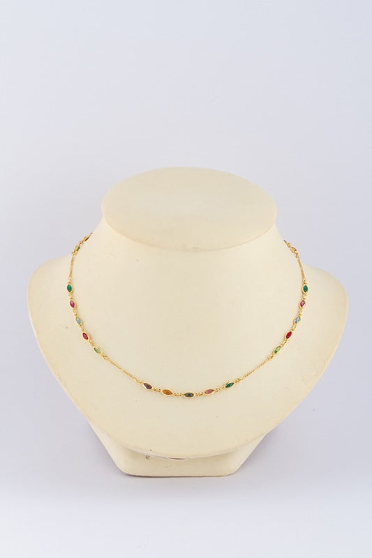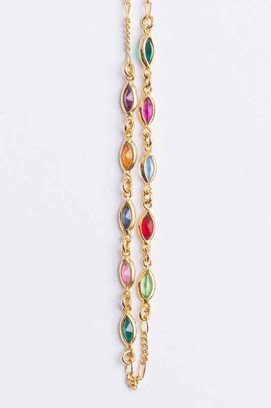 Gold link necklace with various glass colored stones