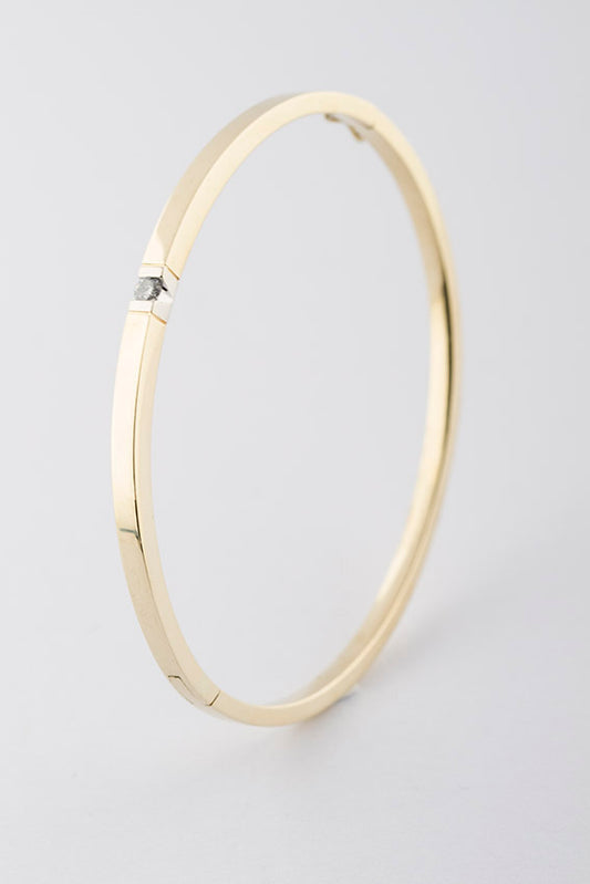 14 carat gold bangle with a 0.09 ct brilliant-cut diamond and hinged clasp.