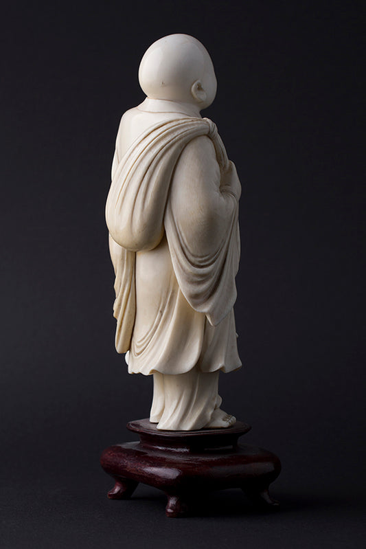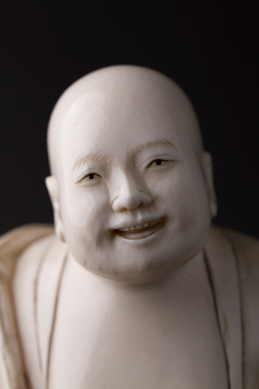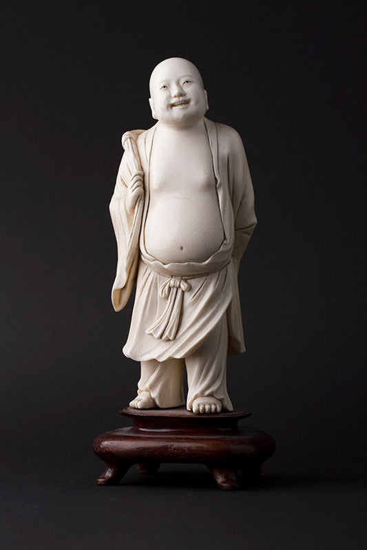 Antique ivory sculpture on an ironwood base by Mi-Le-Fo. He is always depicted smiling, and his long earlobes are characteristic. He carries a bag over his shoulders.