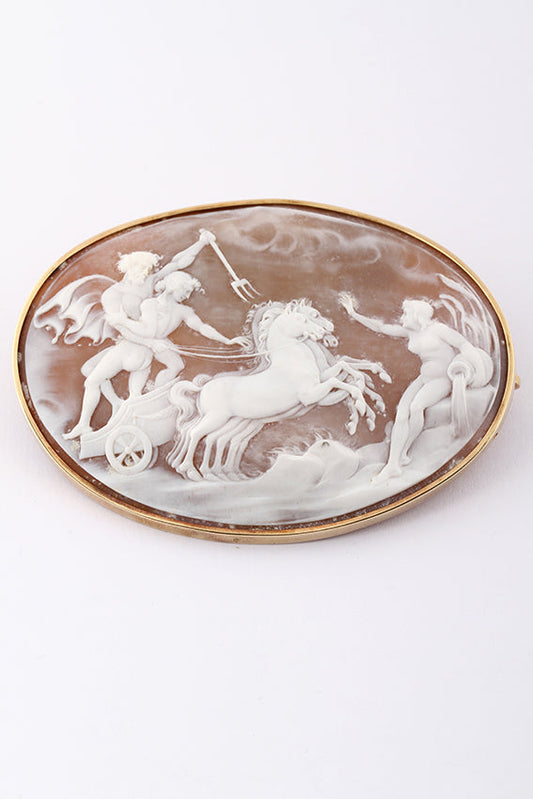 Old large shell cameo in a 14-carat gold frame depicting the Greek mythological scene of Demeter and Persephone. Hades abducts Persephone.
