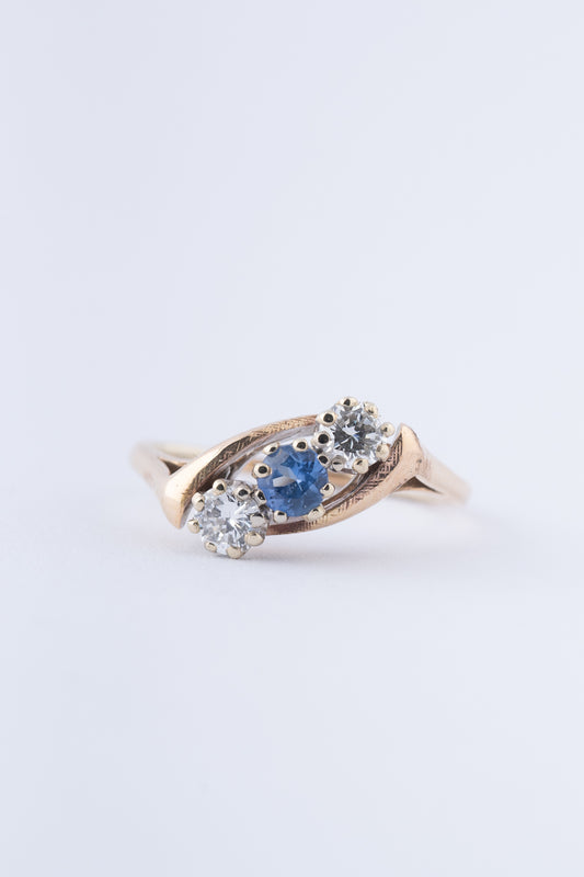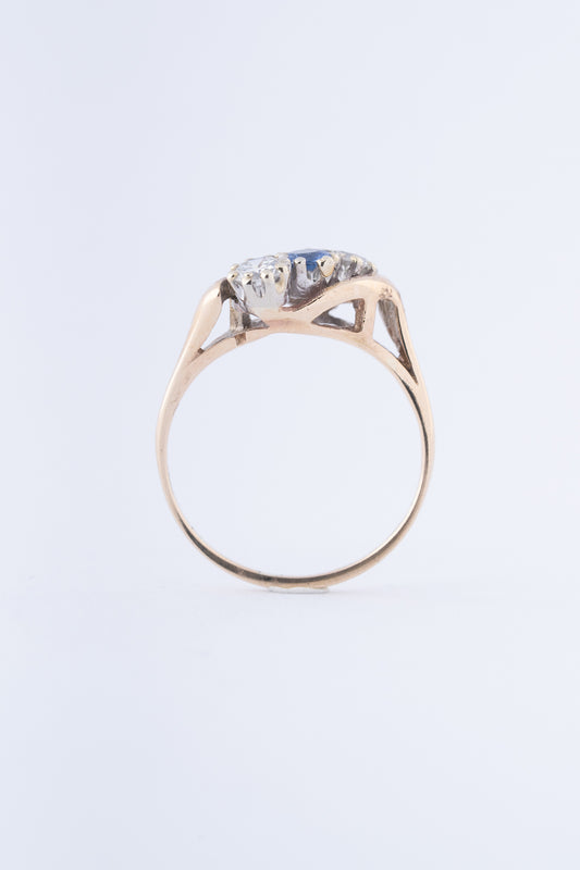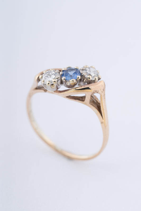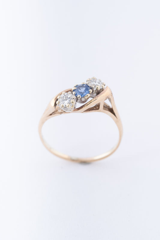 Oude slagring met saffier en 2 briljanten totaal ca. 0.28 ct. (Au 0.561 dzn) Bwg.