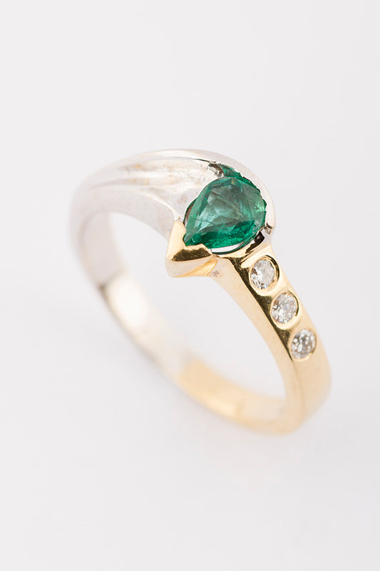 18 carat white and yellow gold ring with emerald and 3 brilliant-cut diamonds.