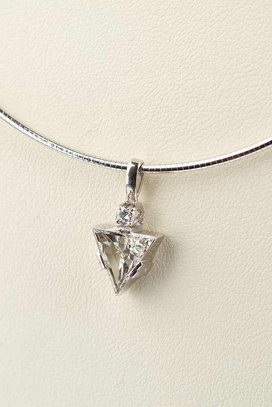 14 kt white gold pendant with a triangle-cut brilliant 0.93 ct (Si) and a brilliant of 0.07 ct. Total 1.00 ct. on a 14 kt white gold omega necklace.