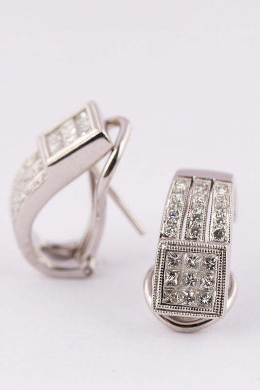 18-karat white gold stud earrings, each set with 9 princess-cut diamonds and 15 round-cut diamonds. Total weight approx. 0.75 ct.