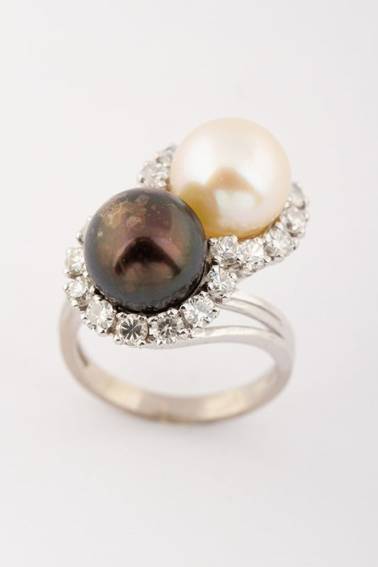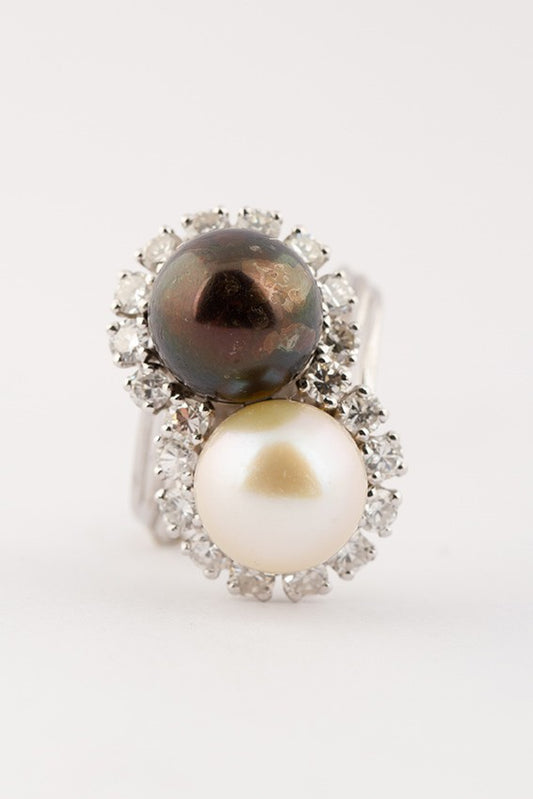 18 kt white gold ring with 20 brilliant-cut diamonds set in platinum (total 1.4 ct.) and 2 cultured pearls.