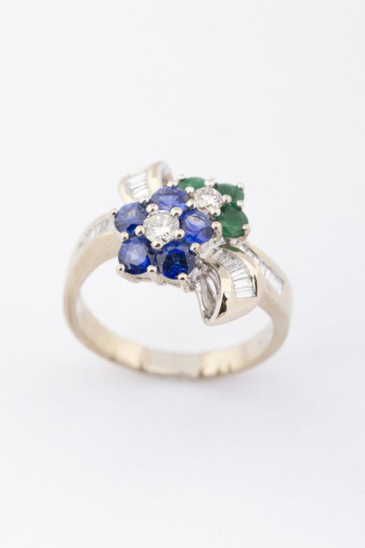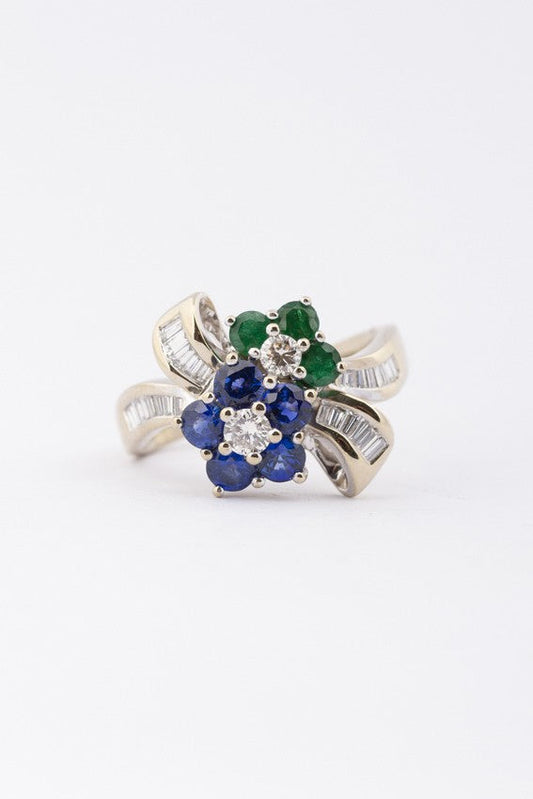 White gold bow ring with sapphire, emerald and diamonds