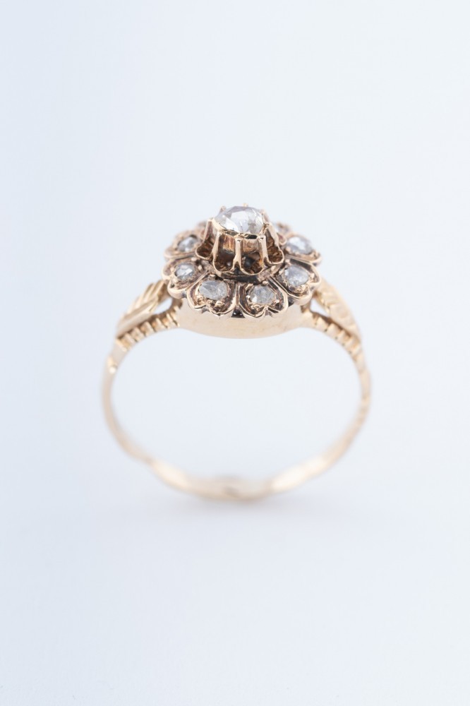 Antieke entourage ring met roos geslepen diamanten. Gehalte: 0.575 dzn. AU (Bwg).