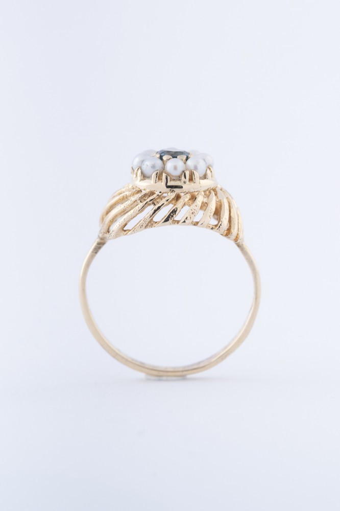 14 krt. gouden entourage ring met blauwe topaas en parels.
