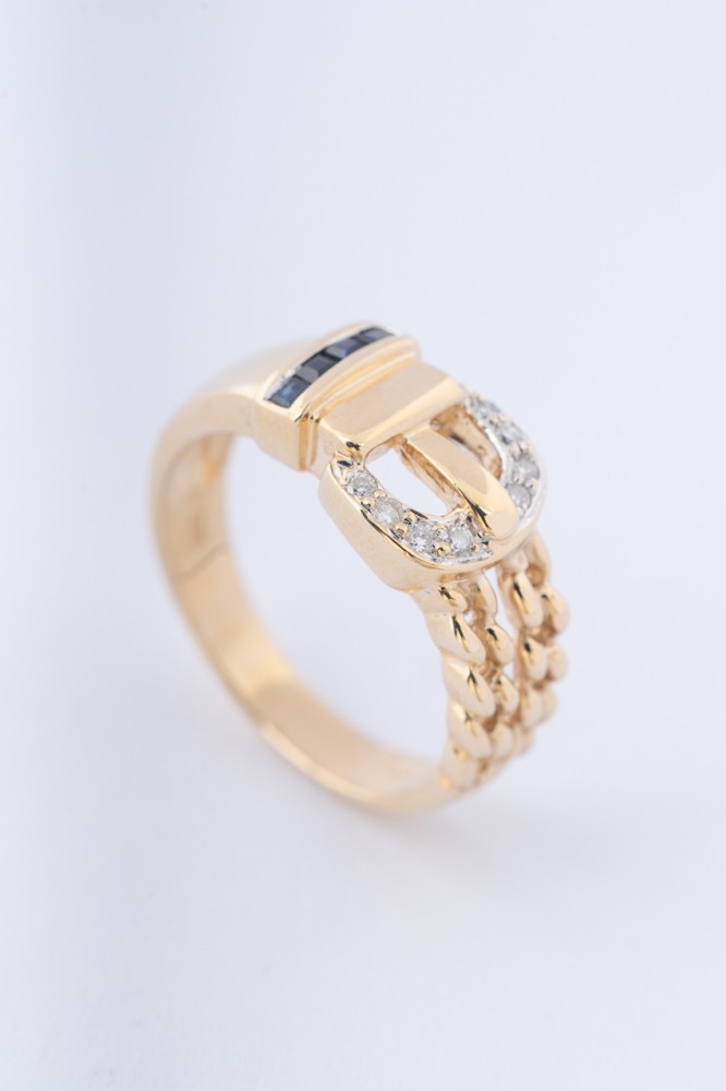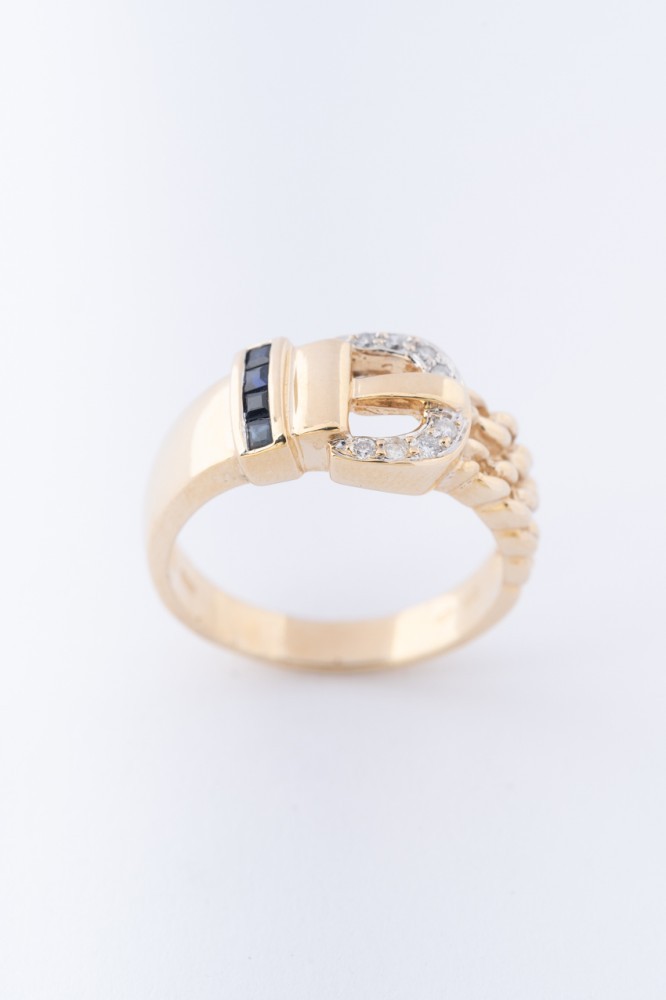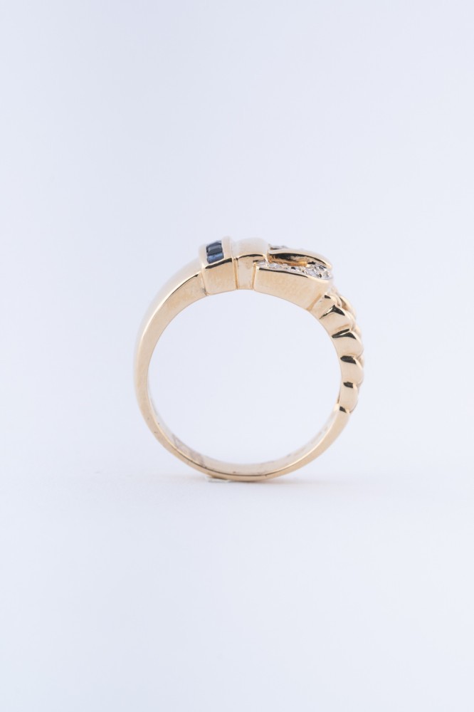 Gouden gesp ring met 8 briljanten en 4 carre geslepen saffieren