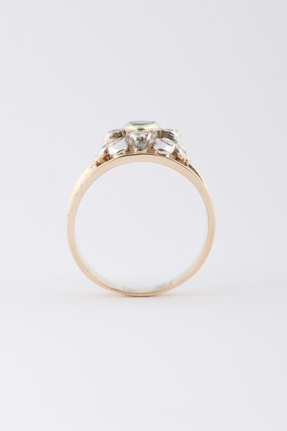 18 krt. gouden hand gestoken ring met smaragd en roos geslepen diamanten in zilver gezet.