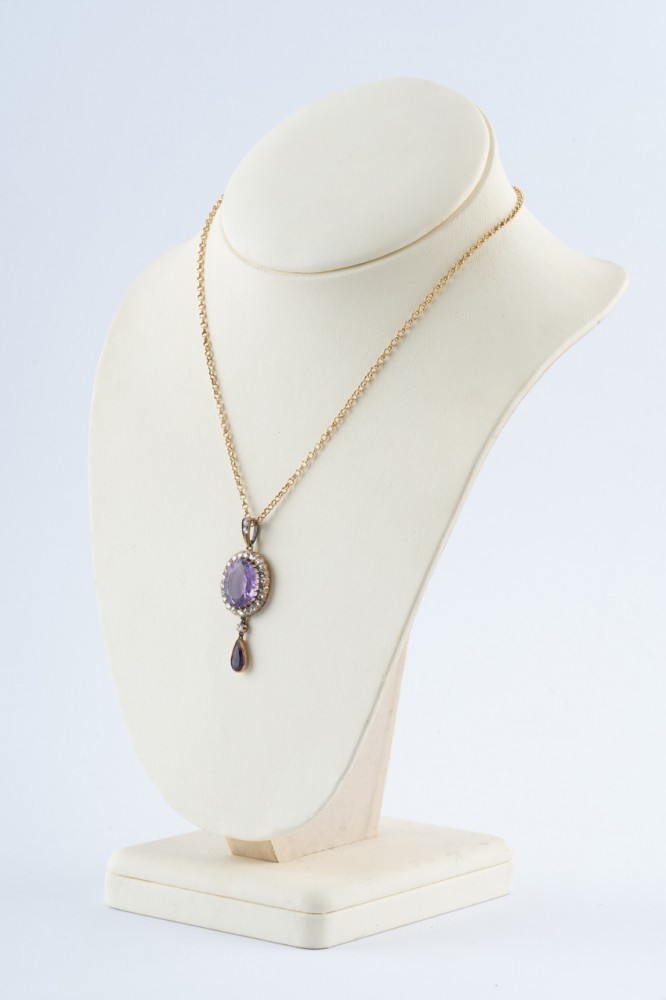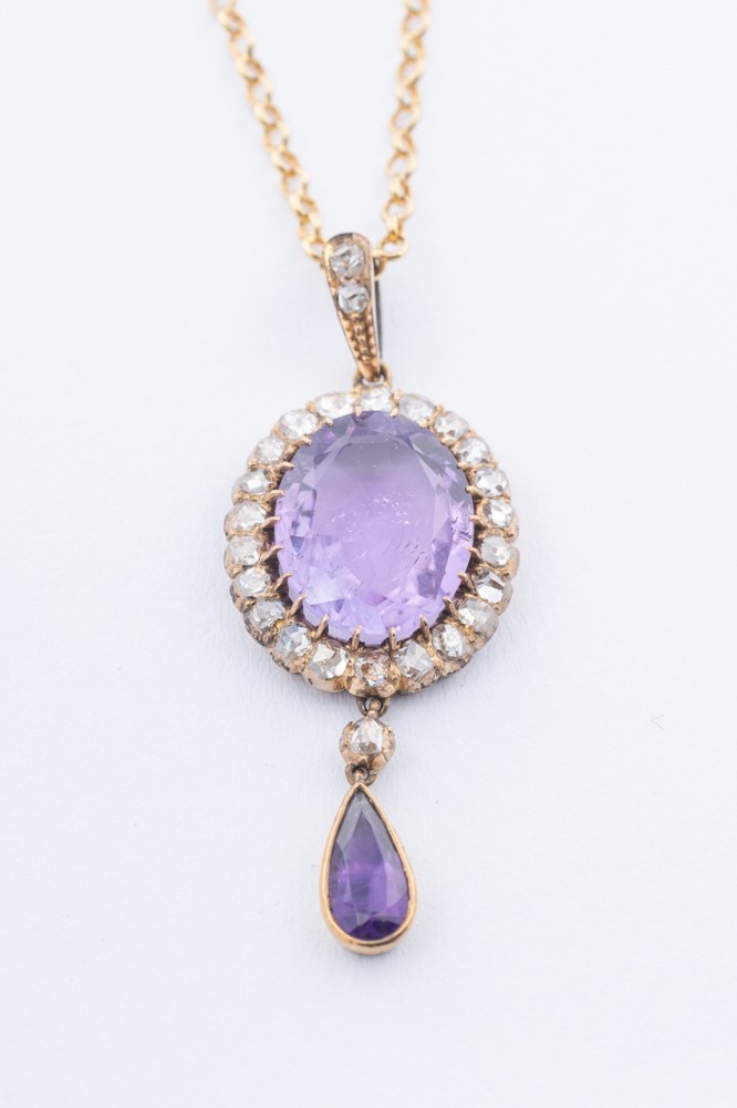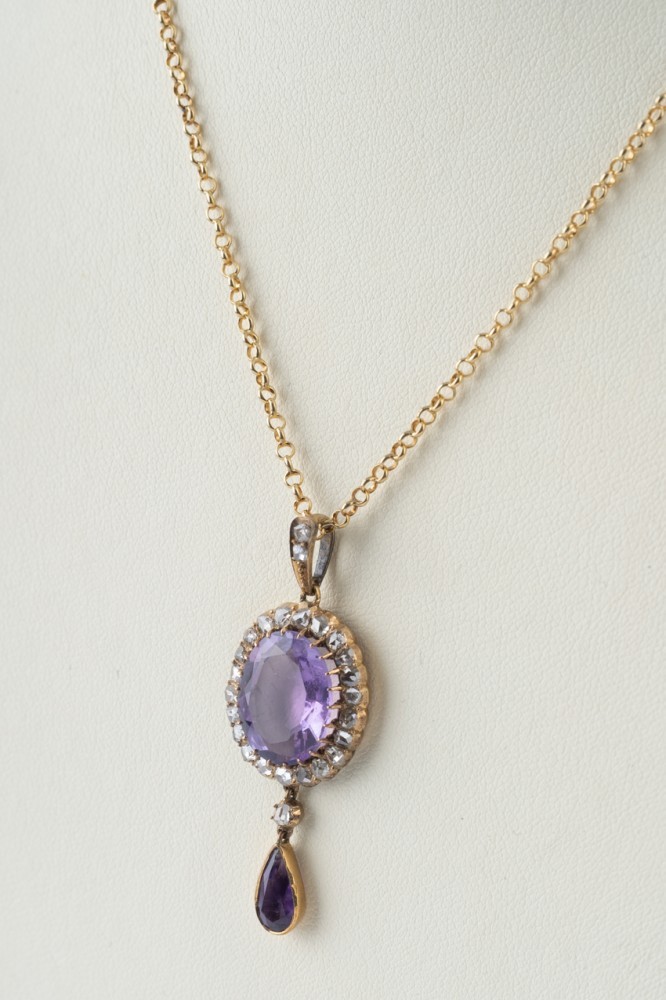 Antieke 14 krt. gouden hanger met 2 amathisten en 2 roos geslepen diamanten aan 14 krt. gouden collier.
