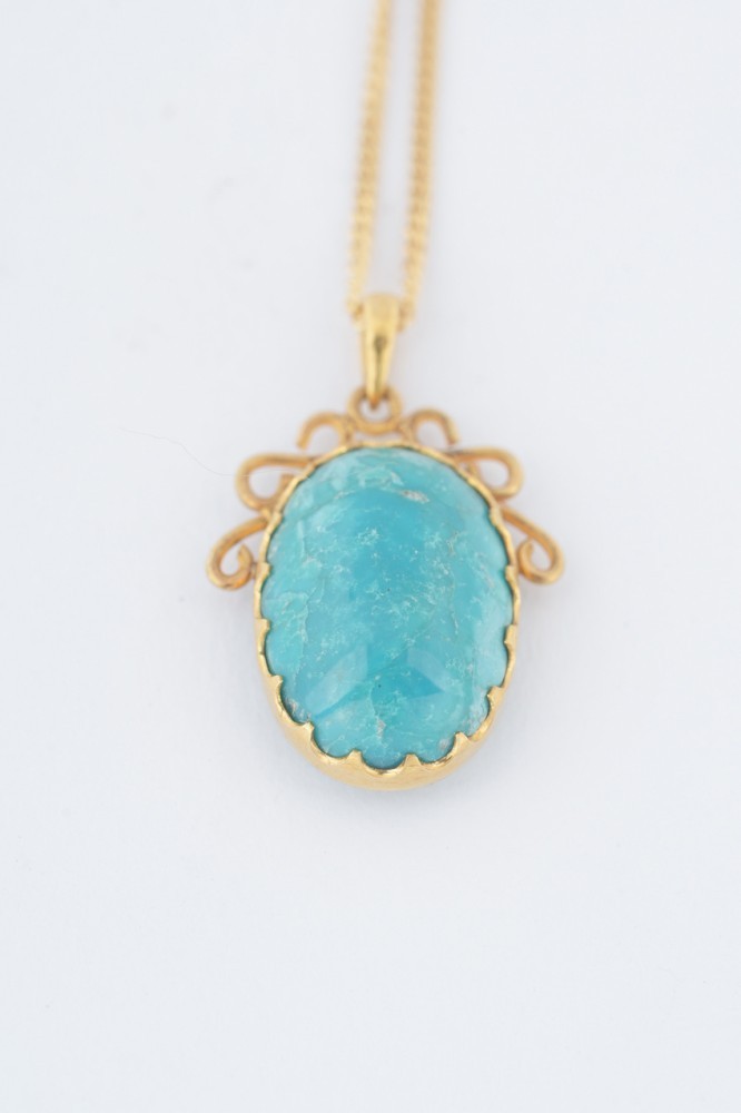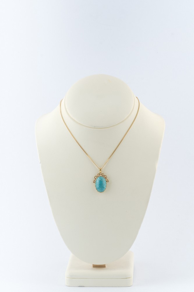 20 krt. gouden hanger met turkoois aan 18 krt. gouden gourmet collier.