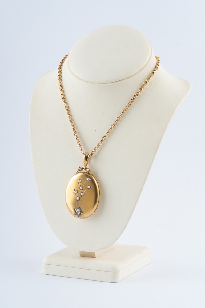 Antiek 14 krt. gouden medaillon (1853-1906) met een roos geslepen diamant en parels aan 14 krt. gouden jasseron collier.