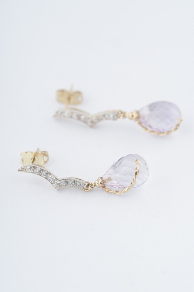 14 krt. gouden oorhangers met in elk een briolet geslepen amethist en 8 oud geslepen briljanten tot. ca. 0.24 ct.