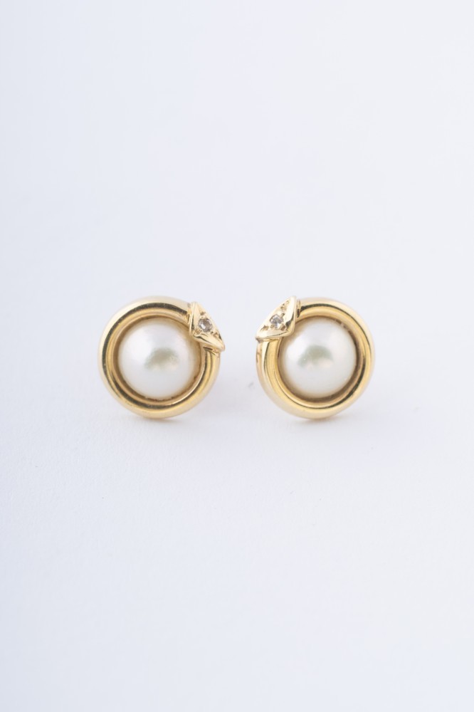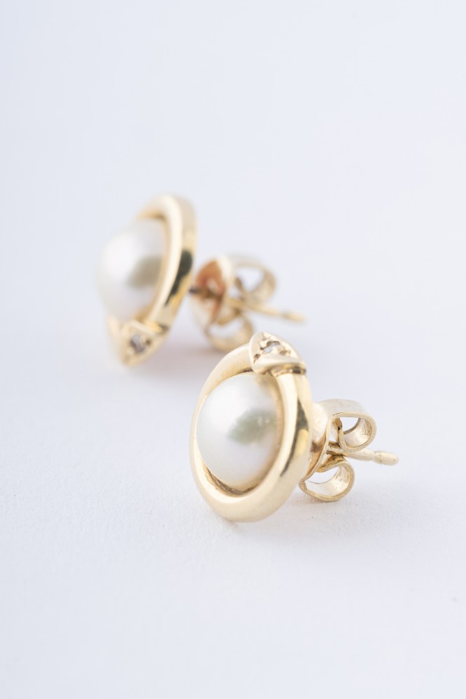 14 krt. gouden oorknoppen met in elk een mabé parel en een diamant (8-kant).