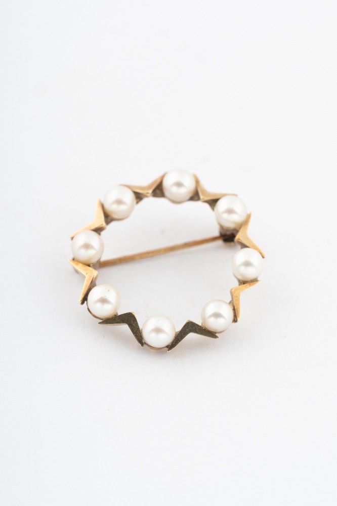 Gouden open broche met cultiv14 krt. gouden open broche met cultivé parels