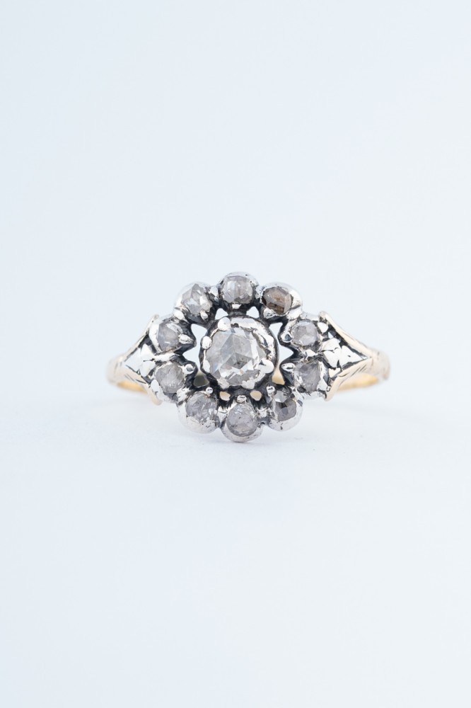 Antieke 14 krt. gouden ring met roos geslepen diamanten in zilver gezet.